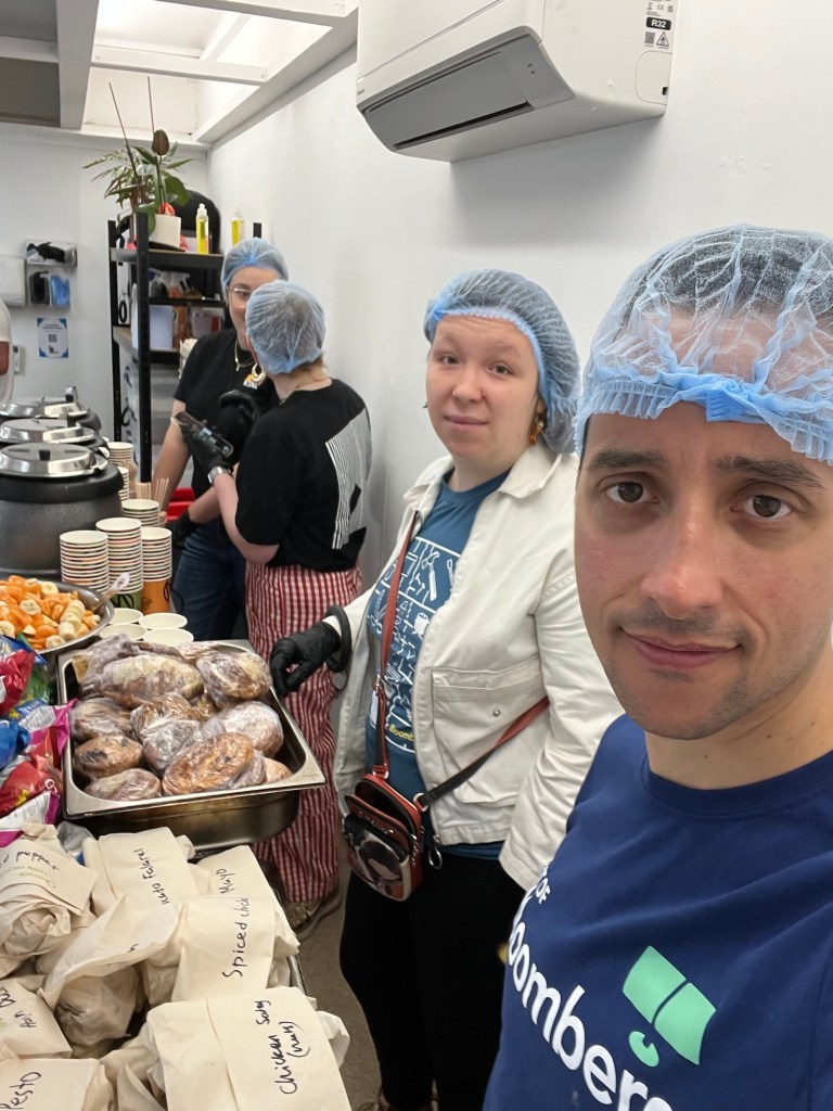 I went to a Bloomberg Volunteering event to feed homeless people. First under the attention of quite an aggrevated lady I cut and packed sandwiches 🥪, when I stand by the pastry and gave it to the visitors. Sometimes they were quite rude, grabbing buns without asking, throwing it back and demanding a return. My colleagues though were perfectly friendly and maintained good spirits.